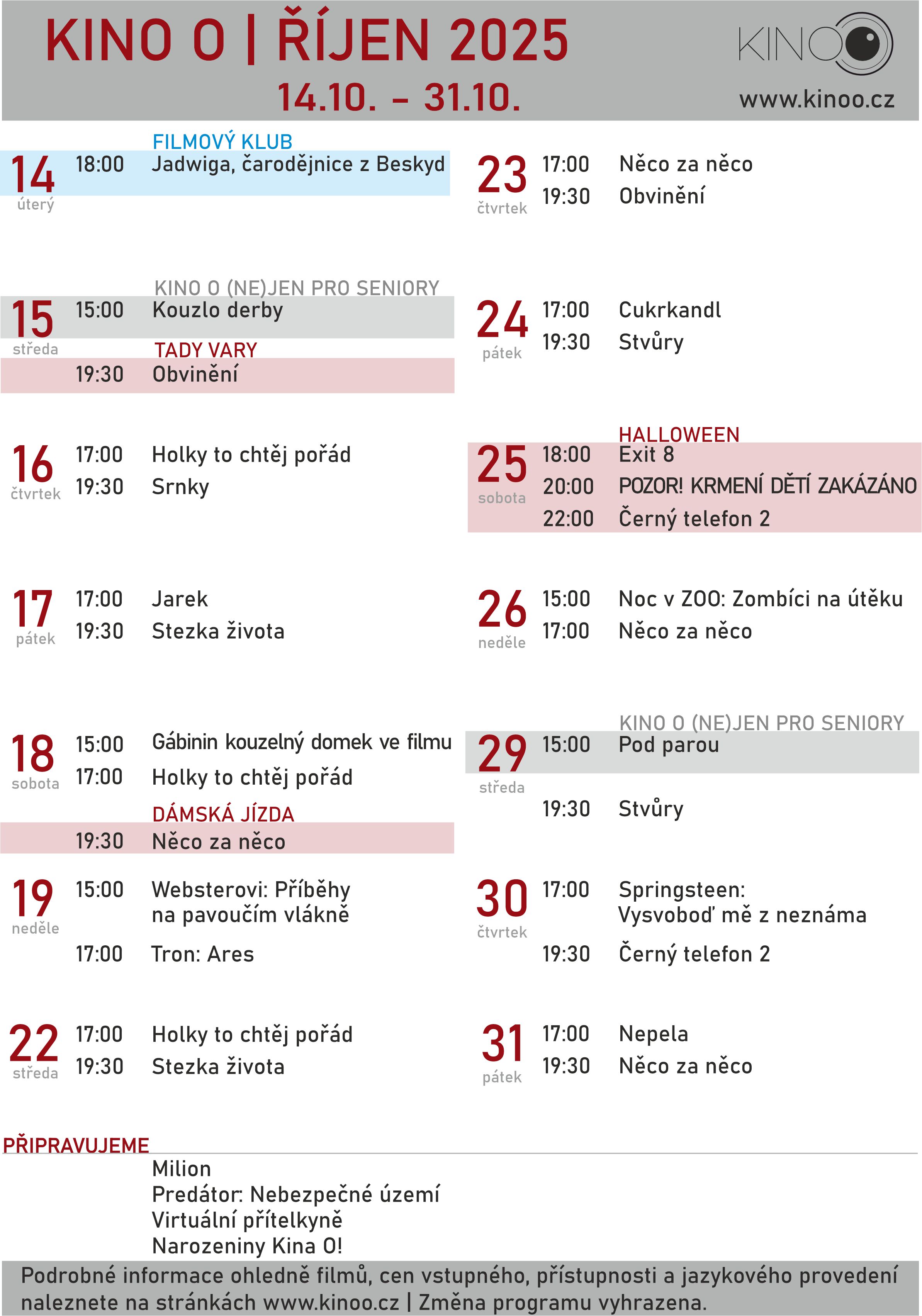 Program Kina O se průběžně doplňuje, sledujte pravidelně náš web a nic Vám neunikne! :)