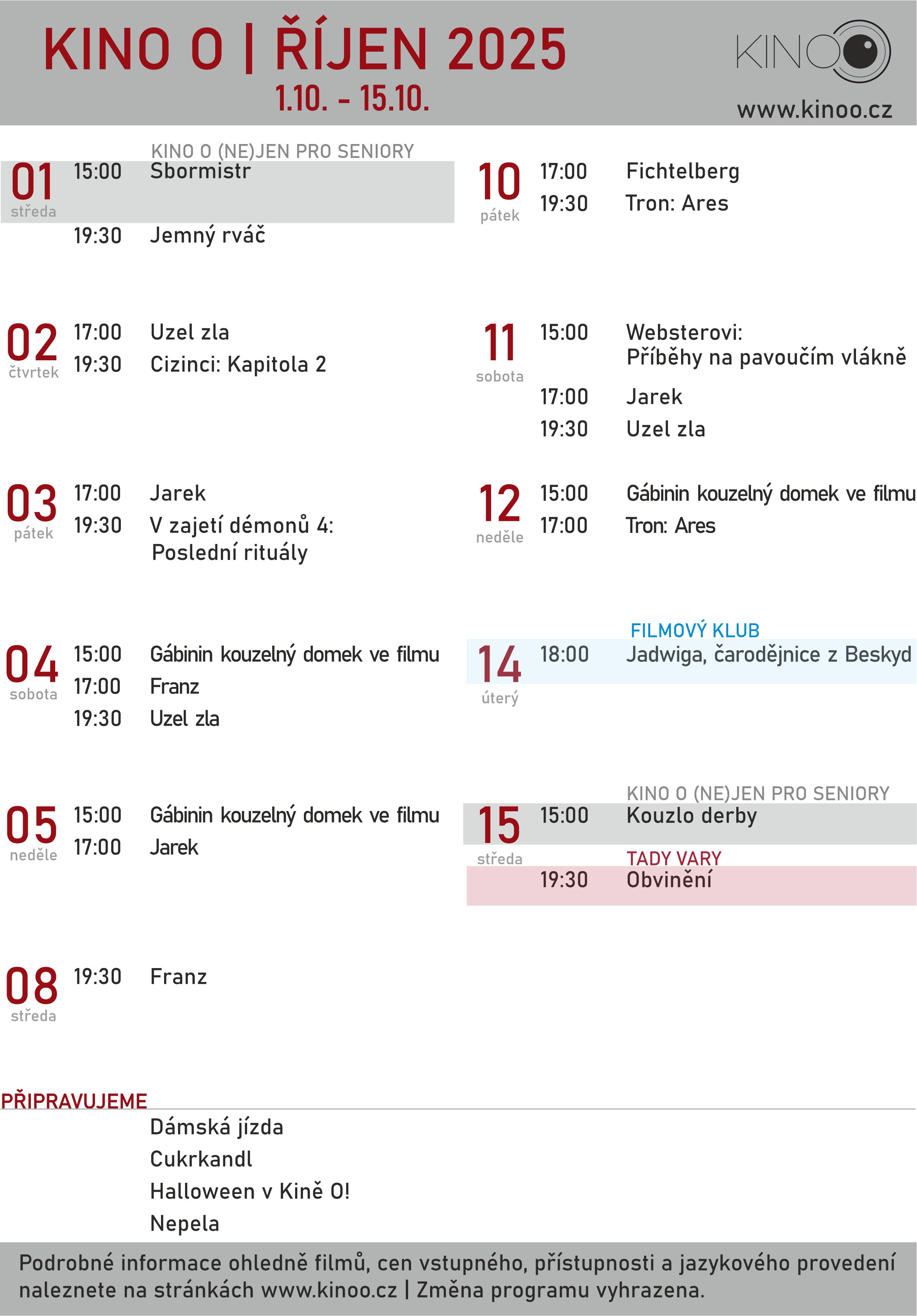 - Provozovatel nenese žádnou zodpovědnost za obsah promítaných filmů, reklam a upoutávek. Každý Návštěvník je povinen předem zvážit, zda jemu či jím doprovázenému dítěti nemůže návštěva vybraného představení přivodit újmu, zejména je pak Návštěvník povinen zvážit, zda je pro osobu mladší 12 let vhodná návštěva kinematografického představení označeného jako nevhodné pro děti do 12 let.
