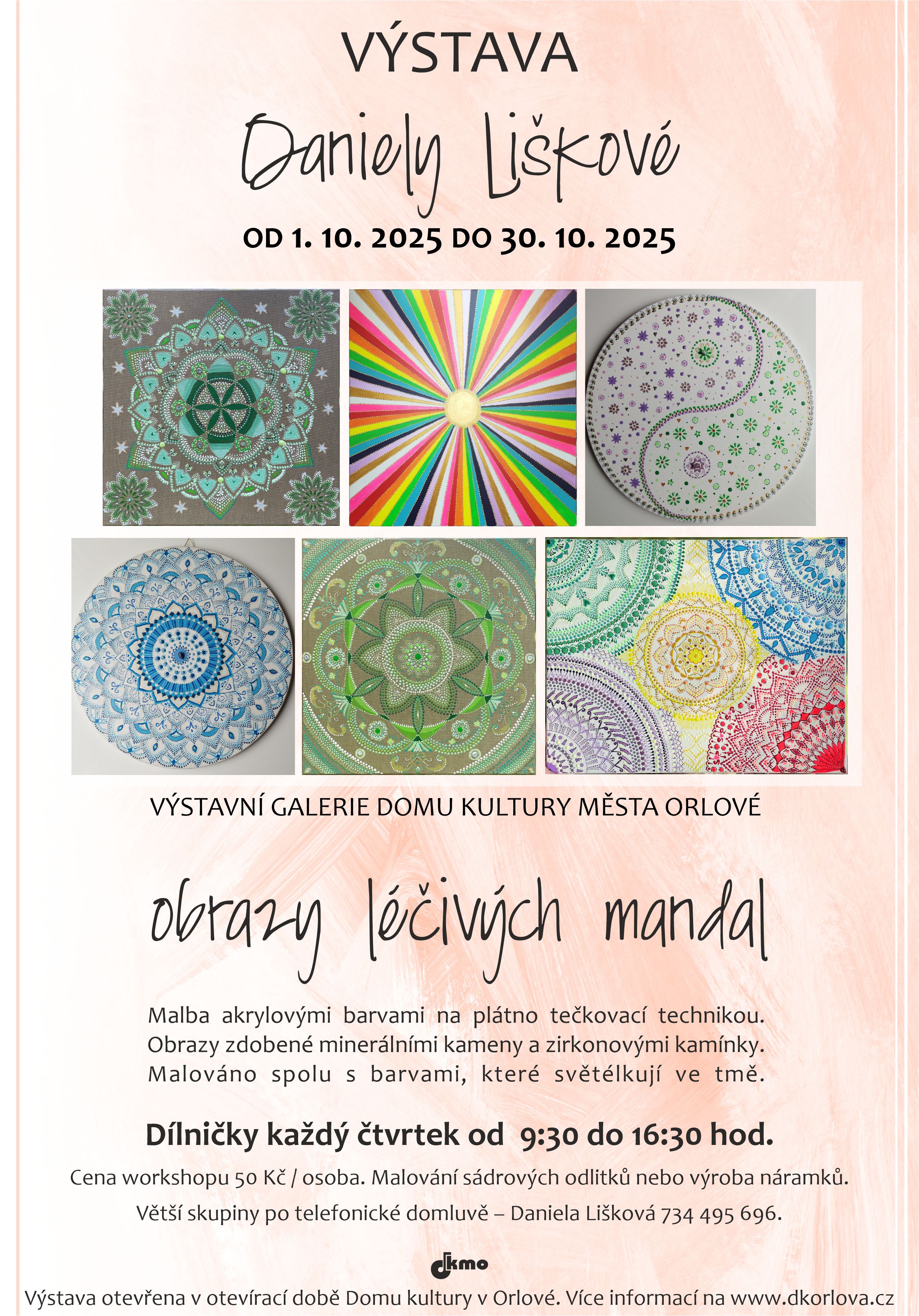 Cena workshopu je 50 Kč / osoba. Vyzkoušíte si malování sádrových odlitků nebo výrobu náramků. Větší skupiny je možné domluvit telefonicky: Daniela Lišková – 734 495 696.